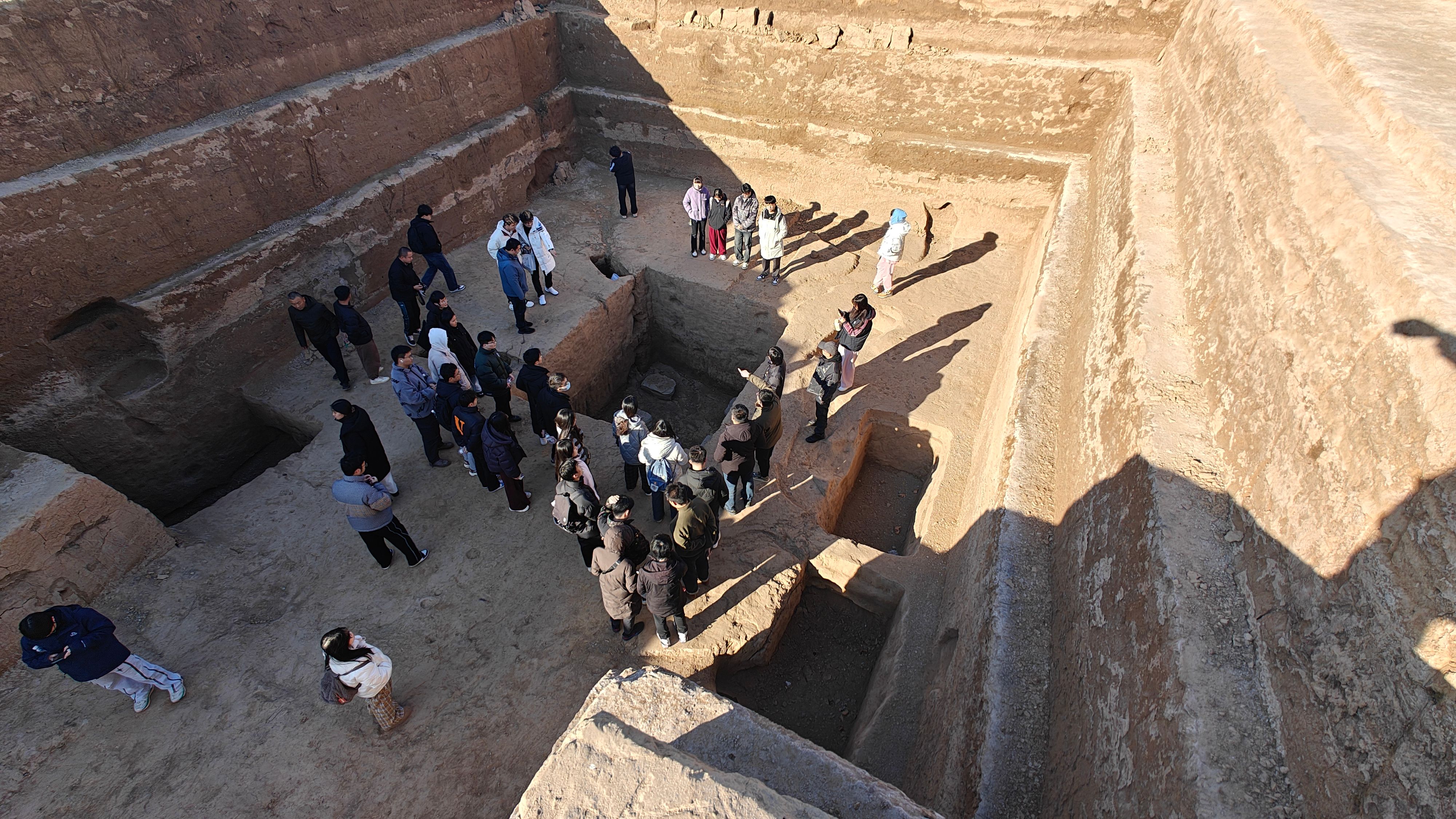 此次实践活动主要集中在淄博临淄区开展。齐都临淄是国家历史文化名城,是我国周、秦、汉时期经济最发达的工商业大都市之一,素有“东方古罗马”的美誉,悠久的历史为临淄留下了丰富的文化遗产。在山东省考古研究院工作人员吴玉鹏的带领下,师生走进考古现场,了解考古发掘工作,近距离观看墓坑和出土器物。在临淄齐国故城考古遗址公园,师生观看夯层清晰规整、夯筑痕迹明显可辨的临淄齐国故城城墙遗迹,登临战国西汉时期齐王宫所在地、著名的“临淄八景”之一桓公台,通过精彩展览和三维电影了解结构严谨、构筑坚固的大城西墙排水道口,感受“齐人智慧杰作,世界城建奇观”。